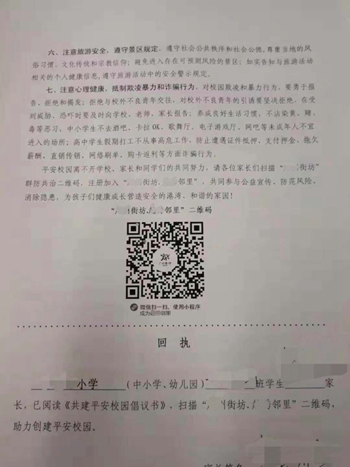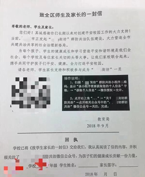 前不久,廣東某地發(fā)起“街坊群防共治隊(duì)伍建設(shè)”,并開設(shè)了微信公眾號(hào)。當(dāng)?shù)亟逃忠浴吨氯珔^(qū)師生及家長(zhǎng)的一封信》的形式,要求師生和家長(zhǎng)關(guān)注其公眾號(hào),并要求學(xué)生及家長(zhǎng)簽名承諾“關(guān)注”。