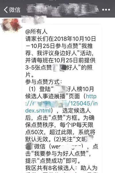 近日,廣東某所幼兒園的家長(zhǎng)們又在群里收到老師發(fā)的通知:“請(qǐng)家長(zhǎng)們?cè)?018年10月10日-10月25日參與點(diǎn)贊‘我推薦、我評(píng)議身邊好人’活動(dòng),并請(qǐng)每班在10月25日前提供3-5張點(diǎn)贊的照片?!?/p>