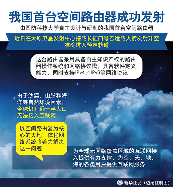 新華社長沙10月29日電(趙寶康、劉于藍)由國防科技大學自主設(shè)計與研制的我國首臺空間路由器,近日在太原衛(wèi)星發(fā)射中心搭載長征四號乙運載火箭發(fā)射升空,準確進入預(yù)定軌道。