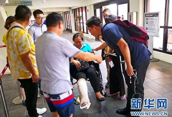 在機場等候的中國乘客秩序井然,許多人舉著國旗合影,非常興奮。一位在塞班開店的王女士腳部骨折,因當地醫(yī)療條件有限,她向領館尋求幫助,經領館協(xié)調,也順利搭上川航飛機回國。