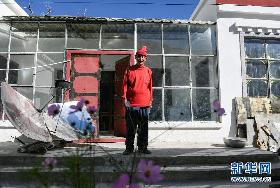 楚松村村民歐珠加措在他的“第四代”新房院子里(9月16日攝)。 新華社記者劉東君攝