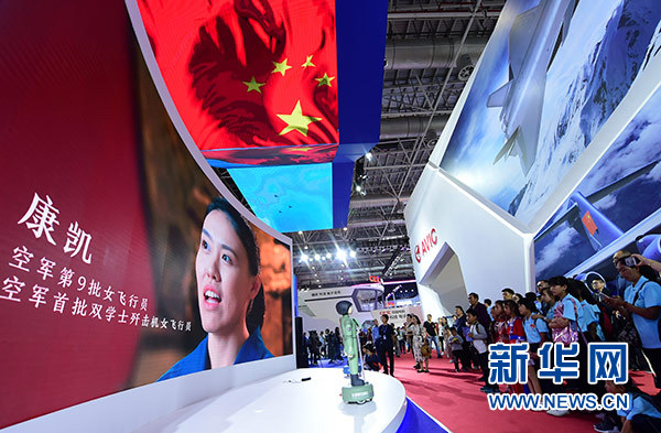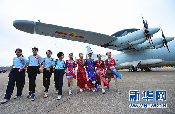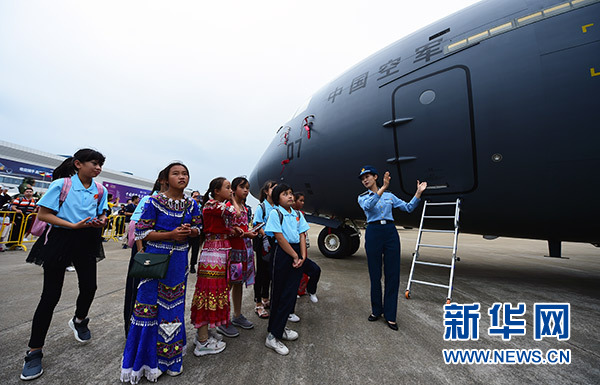 藍(lán)天春蕾女童在航展現(xiàn)場(chǎng)參觀(11月10日攝)。新華社發(fā)(陳藝 攝)