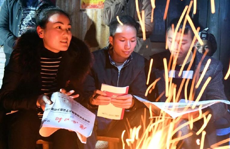 基層干部徐秋華(左)帶領(lǐng)廣西融水苗族自治縣四榮鄉(xiāng)榮地村村民學(xué)習(xí)“鄉(xiāng)村振興戰(zhàn)略”精神 張愛(ài)林 攝