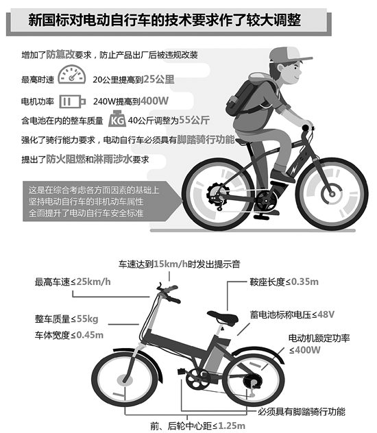 新國(guó)標(biāo)對(duì)電動(dòng)自行車(chē)的技術(shù)要求作了較大調(diào)整(見(jiàn)圖):