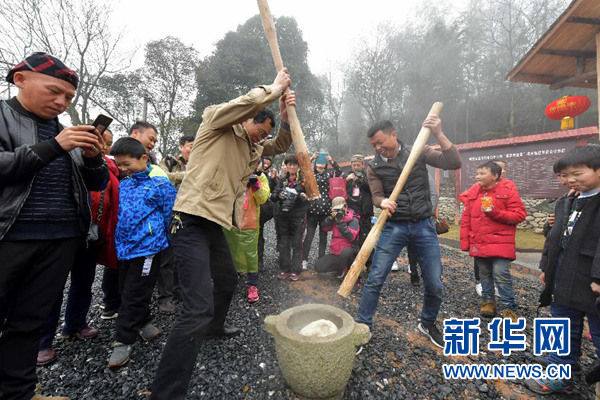 在江西宜春溫湯鎮(zhèn)水口村,游客體驗(yàn)傳統(tǒng)的打糍粑(3月2日攝)。? 新華社記者 彭昭之 攝