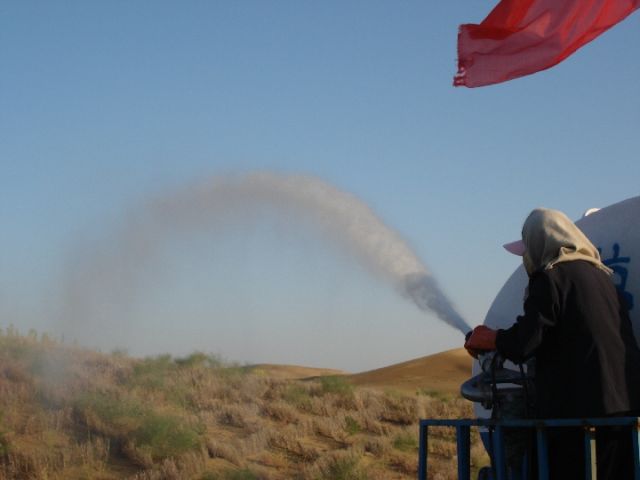治沙人員向荒漠中噴灑藻類(lèi)。(受訪者供圖)