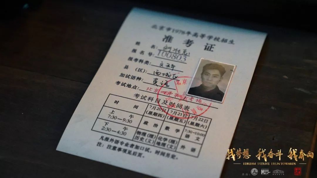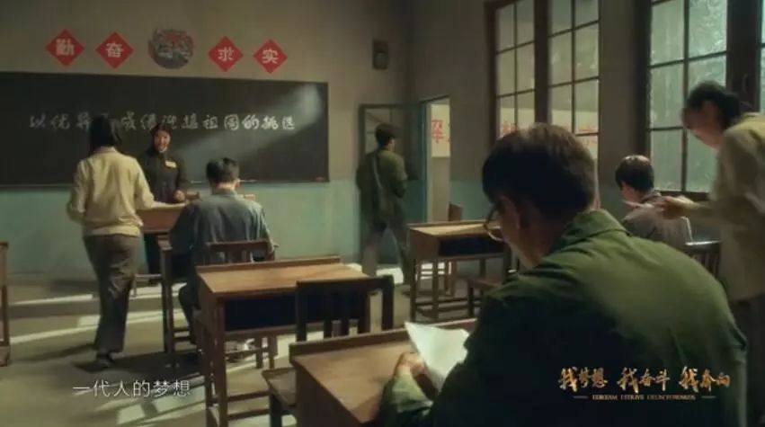 1978年高考恢復(fù),中國由此重新迎來了尊重知識、尊重人才的春天。坐在1978年正在進行高考的教室里,考生劉燁寫下自己作文的最后一句話:“為祖國和人民不懈奮斗”。他在鏡頭前書寫下“奮斗”二字,體現(xiàn)了那個年代的人渴望建設(shè)祖國的一腔熱血。