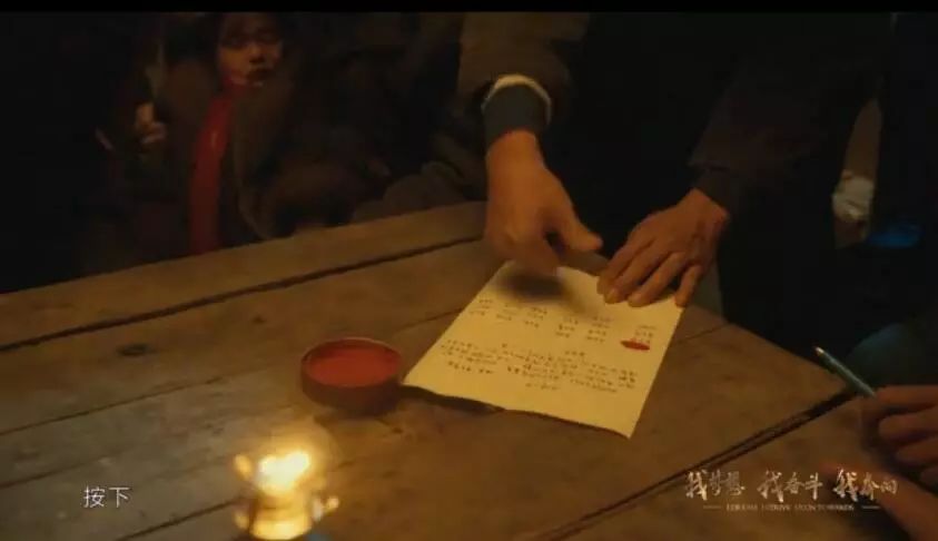 小崗村的變革,有多少人是通過那幅油畫了解到當(dāng)時的場景的,這一次我們讓油畫“動了”起來。在畫面中,所有演員的站位,包括后來進來的劉燁,都精準地參照并還原了小崗村油畫的畫面。變身農(nóng)民的劉燁提著馬燈偷偷進入屋內(nèi),詢問過后,率先在責(zé)任書上按下手印,畫面中的責(zé)任書是以博物館中保存的原版責(zé)任書為參考,完全臨摹后制作的道具,整個道具細致到了每一位農(nóng)民按手印的位置。