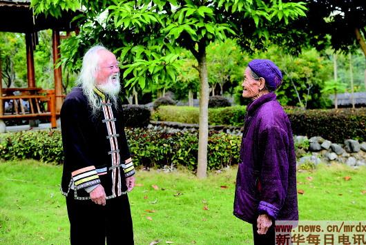 在廣西巴馬瑤族自治縣長(zhǎng)壽島,98歲的長(zhǎng)壽老人羅耀斌(左)在和一名老人交談(11月8日攝)?!⌒氯A社記者陸波岸攝
