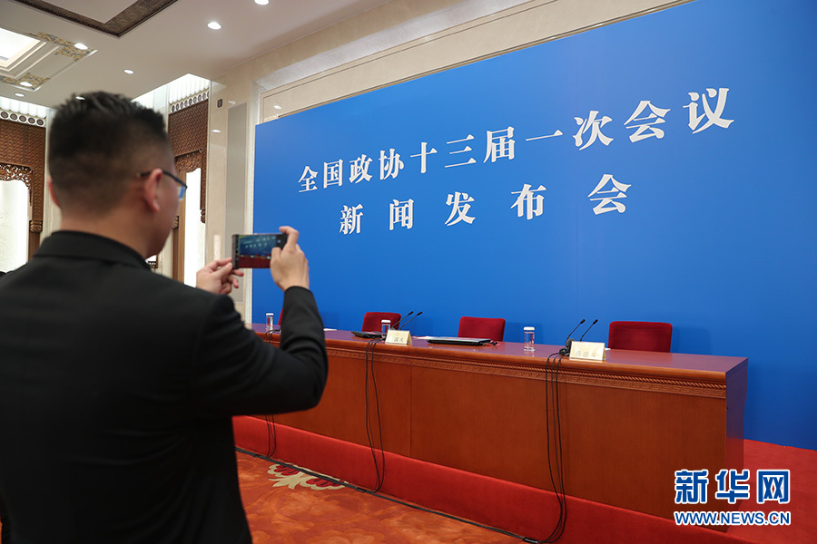 全國政協(xié)十三屆一次會議新聞發(fā)布會3月2日16:30在人民大會堂一層新聞發(fā)布廳召開,大會新聞發(fā)言人王國慶向中外媒體介紹本次大會有關(guān)情況并回答記者提問。圖為發(fā)布會前記者在現(xiàn)場拍攝。新華網(wǎng)/中國政府網(wǎng) 翟子赫攝