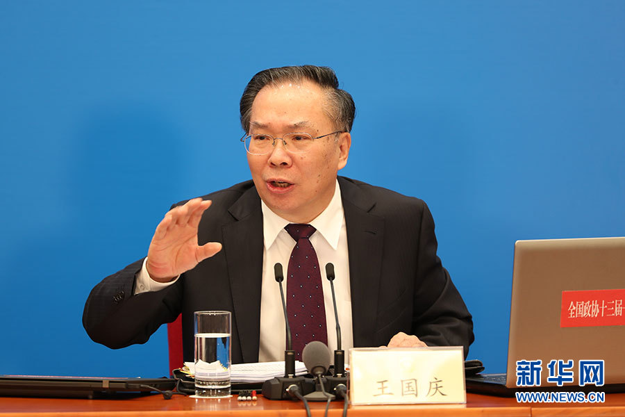 全國政協(xié)十三屆一次會(huì)議新聞發(fā)布會(huì)3月2日16:30在人民大會(huì)堂一層新聞發(fā)布廳召開,大會(huì)新聞發(fā)言人王國慶向中外媒體介紹本次大會(huì)有關(guān)情況并回答記者提問。圖為大會(huì)新聞發(fā)言人王國慶回答記者提問。?新華網(wǎng)/中國政府網(wǎng) 陳杰 攝