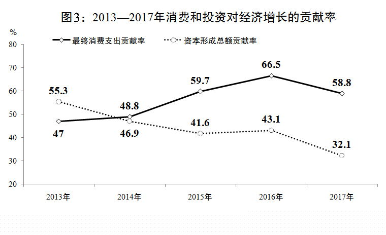 總的來看,2017年經(jīng)濟(jì)運(yùn)行穩(wěn)中向好態(tài)勢持續(xù)發(fā)展,決勝全面建成小康社會又向前邁出堅實(shí)一步。在國內(nèi)外經(jīng)濟(jì)形勢極其錯綜復(fù)雜的情況下,經(jīng)濟(jì)社會發(fā)展取得這樣的成績來之不易,這是以習(xí)近平同志為核心的黨中央堅強(qiáng)領(lǐng)導(dǎo)的結(jié)果,是習(xí)近平新時代中國特色社會主義思想科學(xué)指引的結(jié)果,是黨的十八大以來黨中央、國務(wù)院一系列重大方針政策和重大舉措累積效應(yīng)的結(jié)果,更是全黨全國各族人民共同奮斗、各方面工作久久為功的結(jié)果。五年來,各地區(qū)各部門以習(xí)近平新時代中國特色社會主義思想為指引,堅持穩(wěn)中求進(jìn)工作總基調(diào),貫徹新發(fā)展理念,“十二五”規(guī)劃勝利完成,“十三五”規(guī)劃順利實(shí)施。一是經(jīng)濟(jì)實(shí)力顯著增強(qiáng)。國內(nèi)生產(chǎn)總值從2012年的54萬億元增加到82.7萬億元,年均增長7.1%,對世界經(jīng)濟(jì)增長的貢獻(xiàn)率超過30%。二是發(fā)展質(zhì)量和效益明顯提高。全國一般公共預(yù)算收入從11.7萬億元增至17.3萬億元。全員勞動生產(chǎn)率從人均7.3萬元提高到10萬元以上。居民人均可支配收入從1.7萬元增至2.6萬元,增速總體快于經(jīng)濟(jì)增長,城鄉(xiāng)居民收入倍差由2.88∶1下降至2.71∶1。單位國內(nèi)生產(chǎn)總值能耗降低20.9%。三是經(jīng)濟(jì)結(jié)構(gòu)發(fā)生重大變革。需求結(jié)構(gòu)“消費(fèi)超投資”,最終消費(fèi)對經(jīng)濟(jì)增長的貢獻(xiàn)率提高了近4個百分點(diǎn)。產(chǎn)業(yè)結(jié)構(gòu)“三產(chǎn)超二產(chǎn)”,服務(wù)業(yè)占國民經(jīng)濟(jì)的比重不斷上升。區(qū)域發(fā)展格局不斷優(yōu)化,新型城鎮(zhèn)化扎實(shí)推進(jìn),8000多萬農(nóng)業(yè)轉(zhuǎn)移人口成為城鎮(zhèn)居民。四是新舊動能加快接續(xù)轉(zhuǎn)換。供給側(cè)結(jié)構(gòu)性改革扎實(shí)推進(jìn),有效改善了市場供求關(guān)系和企業(yè)盈利狀況。創(chuàng)新驅(qū)動發(fā)展戰(zhàn)略深入實(shí)施,天宮、蛟龍、天眼、悟空、墨子、大飛機(jī)等重大科技成果相繼問世,新產(chǎn)業(yè)新業(yè)態(tài)新模式層出不窮,傳統(tǒng)產(chǎn)業(yè)通過改造升級煥發(fā)生機(jī)。五是市場主體活力持續(xù)釋放。營商環(huán)境不斷優(yōu)化,產(chǎn)權(quán)保護(hù)不斷加強(qiáng),公平競爭市場環(huán)境進(jìn)一步健全。五年來,國務(wù)院部門行政審批事項(xiàng)削減44%,中央層面核準(zhǔn)的企業(yè)投資項(xiàng)目減少90%,中央政府定價項(xiàng)目縮減80%。大眾創(chuàng)業(yè)萬眾創(chuàng)新蓬勃發(fā)展,全國日均新登記企業(yè)從5400戶上升到1.66萬戶,活躍度保持在70%左右,經(jīng)濟(jì)社會發(fā)展內(nèi)生動力不斷增強(qiáng)。六是改革開放全面深化。重要領(lǐng)域和關(guān)鍵環(huán)節(jié)改革取得突破性進(jìn)展,主要領(lǐng)域改革主體框架基本確立?!耙粠б宦贰背h由構(gòu)想逐步變?yōu)楝F(xiàn)實(shí),貿(mào)易大國地位更加鞏固,利用外資保持穩(wěn)定增長,我國對世界經(jīng)濟(jì)發(fā)展的影響力大幅提升。七是民生福祉得到有效保障。城鎮(zhèn)新增就業(yè)6600萬人以上,脫貧攻堅取得決定性進(jìn)展,貧困人口減少6800多萬。覆蓋城鄉(xiāng)居民的社會保障體系基本建立,基本公共服務(wù)均等化程度不斷提高。八是生態(tài)環(huán)境建設(shè)保護(hù)力度持續(xù)加大。大氣、水、土壤污染防治行動取得明顯成效,重點(diǎn)區(qū)域PM2.5平均濃度下降30%左右,生態(tài)文明制度體系加快形成,環(huán)境狀況得到改善。