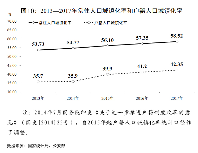 五是以人為核心的新型城鎮(zhèn)化建設(shè)扎實(shí)推進(jìn)。農(nóng)業(yè)轉(zhuǎn)移人口市民化有序推進(jìn),戶籍制度改革和居住證制度落地實(shí)施。全國常住人口城鎮(zhèn)化率達(dá)到58.52%,戶籍人口城鎮(zhèn)化率達(dá)到42.35%,均比上年增加1個百分點(diǎn)左右。城鎮(zhèn)化空間格局持續(xù)優(yōu)化,長三角、長江中游、成渝、哈長、中原、北部灣等城市群規(guī)劃加快實(shí)施,關(guān)中平原、呼包鄂榆等跨省區(qū)城市群規(guī)劃編制完成。以市場化方式規(guī)范推進(jìn)特色小鎮(zhèn)和小城鎮(zhèn)建設(shè)。新型城鎮(zhèn)化綜合試點(diǎn)取得積極進(jìn)展。