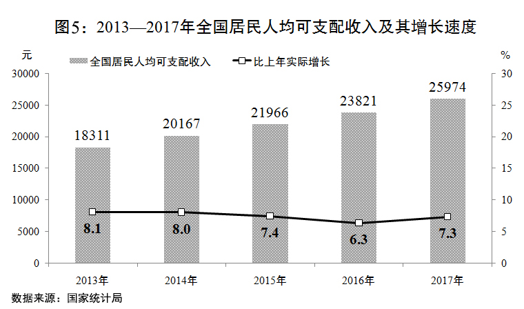 全國居民人均可支配收入達(dá)到25974元,實(shí)際增長7.3%,高于國內(nèi)生產(chǎn)總值增速0.4個百分點(diǎn),農(nóng)村居民收入增長繼續(xù)快于城鎮(zhèn)居民。