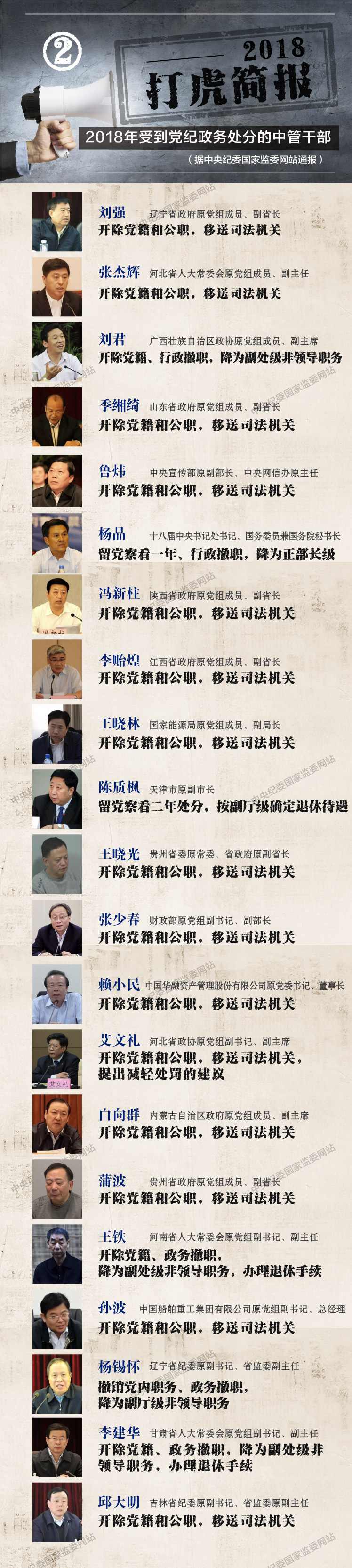 ——嚴重違紀、嚴重觸犯刑律的黨員必須開除黨籍;涉及嚴重違法犯罪,必須移送司法機關。2018年公布處理結果的21名中管干部里,18人被開除黨籍,15人被移送檢察機關審查起訴。