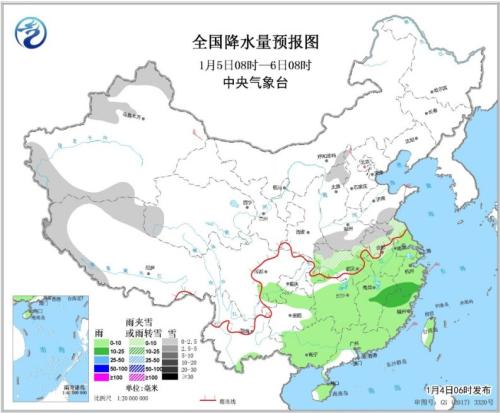 1月4日08時至5日08時,黑龍江中東部、北疆北部和南疆西部山區(qū)、青海中東部、西藏東部和西部、川西高原、陜西中南部、湖北西部、黃淮西部和東南部等地的部分地區(qū)有小雪或雨夾雪;江漢、江淮及其以南大部地區(qū)、西南地區(qū)東部和南部等地的部分地區(qū)有小到中雨,江西中北部、浙江中部和廣西東北部等地的部分地區(qū)有大雨(25~35毫米)。內(nèi)蒙古中北部、黑龍江東北部、遼東半島和山東半島等地的部分地區(qū)有4~6級及以上風(見圖1)。北部灣、瓊州海峽、廣東西部沿岸部分海域?qū)⒂写箪F天氣。
