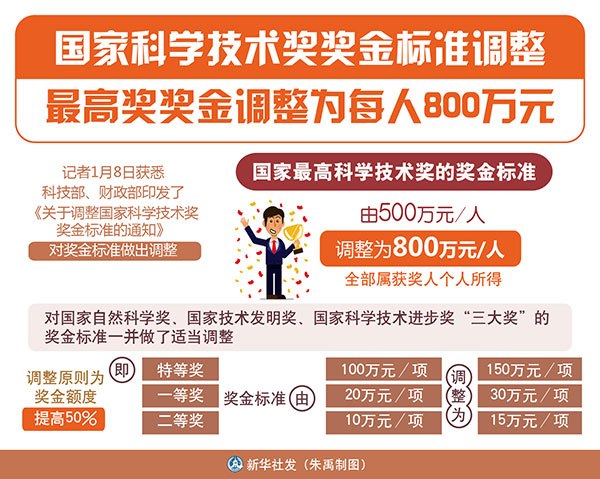 圖表:國家科學技術獎獎金標準調整 最高獎獎金調整為每人800萬元 新華社發(fā) 朱禹 制圖