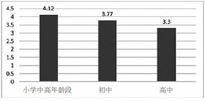 兒童專注自己事情的心理品質(zhì)在小學(xué)中高年段、初中和高中表現(xiàn)出明顯差異,小學(xué)生專注品質(zhì)分值最高,為4.12分,到高中生降為3.3分。這個(gè)變化有兩方面的解釋。一是隨著年齡的增加兒童注意力的集中品質(zhì)有所下降,更容易分散;二是隨著年齡的增加,兒童注意力分配水平能力在提升。
