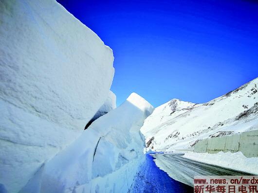 艾肯達坂上公路邊堆起的高大的雪墻。李曉玲攝