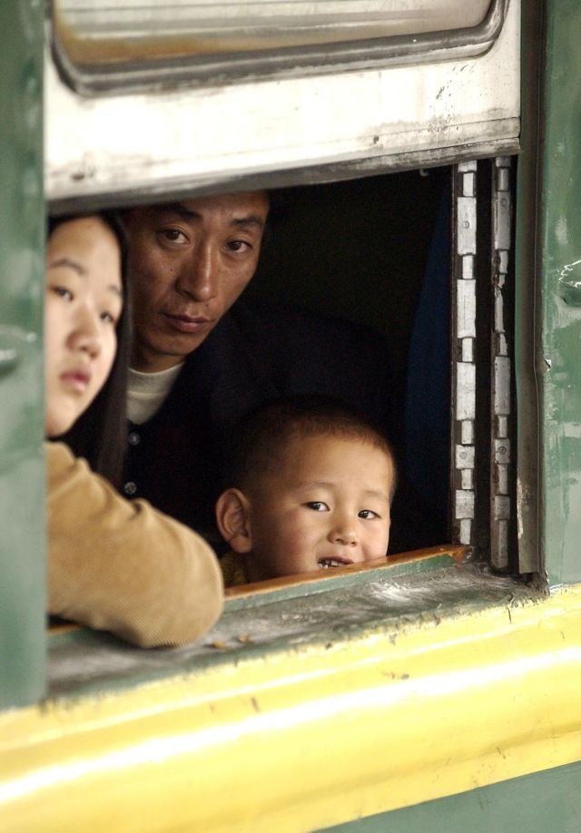 2004年,在廣州火車站登上返鄉(xiāng)列車的乘客通過車窗向外張望。