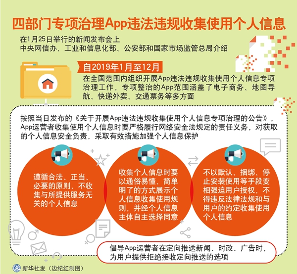 按照當(dāng)日發(fā)布的《關(guān)于開展App違法違規(guī)收集使用個人信息專項治理的公告》,App運營者收集使用個人信息時要嚴(yán)格履行網(wǎng)絡(luò)安全法規(guī)定的責(zé)任義務(wù),對獲取的個人信息安全負(fù)責(zé),采取有效措施加強個人信息保護。遵循合法、正當(dāng)、必要的原則,不收集與所提供服務(wù)無關(guān)的個人信息;收集個人信息時要以通俗易懂、簡單明了的方式展示個人信息收集使用規(guī)則,并經(jīng)個人信息主體自主選擇同意;不以默認(rèn)、捆綁、停止安裝使用等手段變相強迫用戶授權(quán),不得違反法律法規(guī)和與用戶的約定收集使用個人信息。倡導(dǎo)App運營者在定向推送新聞、時政、廣告時,為用戶提供拒絕接收定向推送的選項。