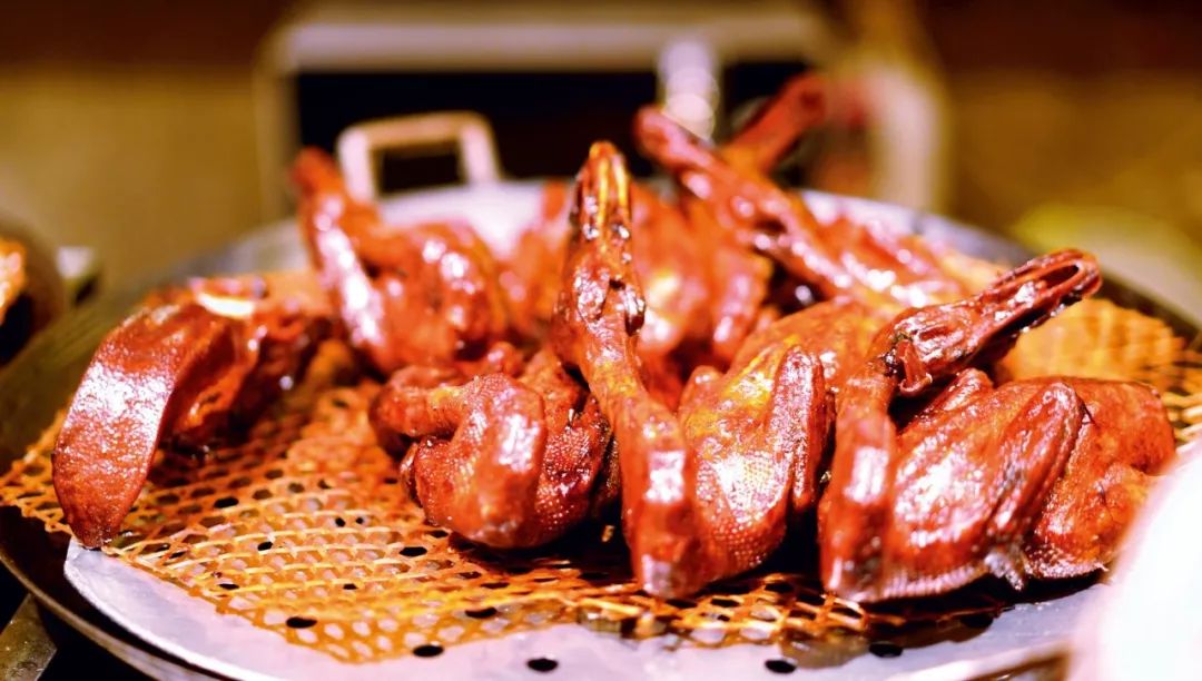 剛烤完的鴨子,一刀刀片好,皮肉分離。鴨皮蘸糖,放入口中,無(wú)須咀嚼,鴨皮入口即化,酥香悠長(zhǎng)的回味在齒間彌漫。