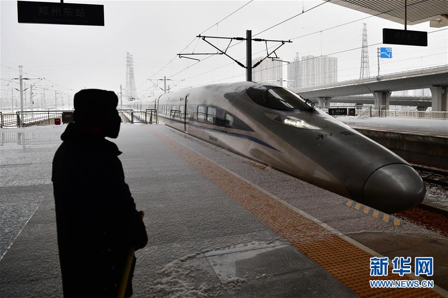 2月10日,一列高鐵列車迎著風(fēng)雪駛?cè)豚嵵輺|站。當(dāng)日是農(nóng)歷正月初六,多地迎來返程客流高峰。 新華社記者 馮大鵬 攝