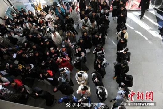 2月13日,北京東棉花胡同里,考生排隊等待參加中央戲劇學院招生專業(yè)考試。逾6.7萬人次報考,為歷年最高。