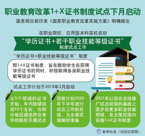“職教20條”提出,從2019年開始,在職業(yè)院校、應用型本科高校啟動“學歷證書+若干職業(yè)技能等級證書”制度試點(以下稱1+X證書制度試點)工作。試點工作要進一步發(fā)揮好學歷證書作用,夯實學生可持續(xù)發(fā)展基礎(chǔ),鼓勵職業(yè)院校學生在獲得學歷證書的同時,積極取得多類職業(yè)技能等級證書,提高就業(yè)創(chuàng)業(yè)本領(lǐng),緩解結(jié)構(gòu)性就業(yè)矛盾。