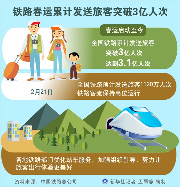 新華社北京2月21日電(記者樊曦)記者從中國鐵路總公司獲悉,春運(yùn)啟動(dòng)至今,全國鐵路累計(jì)發(fā)送旅客突破3億人次,達(dá)到3.1億人次。