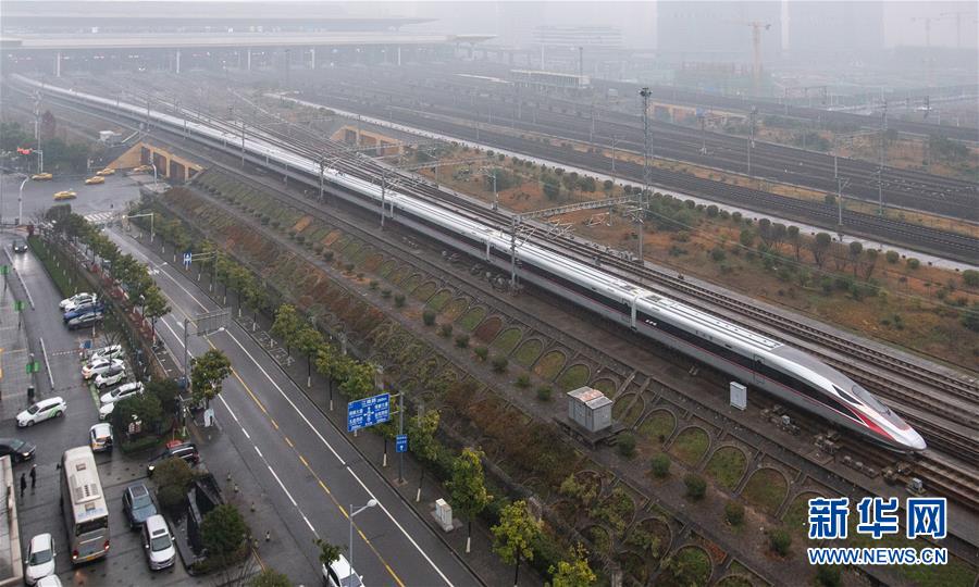 1月5日,超長(zhǎng)版時(shí)速350公里“復(fù)興號(hào)”G9次動(dòng)車(chē)組駛?cè)氡本┠险尽P氯A社發(fā)(陳曉根 攝)