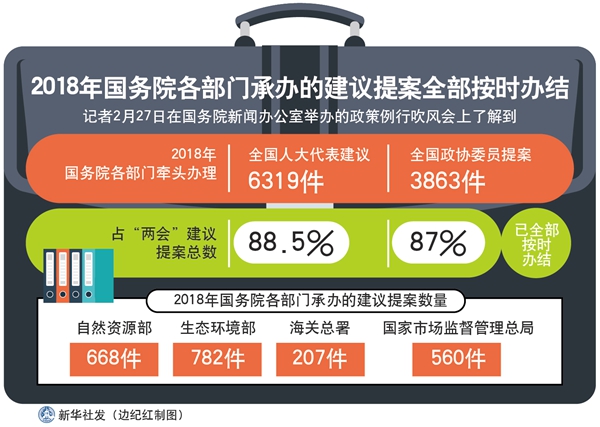 新華社北京2月27日電(胡璐、張涵)2018年,國務(wù)院各部門牽頭辦理全國人大代表建議6319件,全國政協(xié)委員提案3863件,分別占“兩會”建議提案總數(shù)的88.5%和87%,已全部按時辦結(jié)。