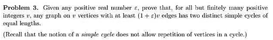 讓中國隊全軍覆沒的第3題,翻譯過來的大致意思是:給定任何一個正實數(shù)e,證明除了有限個正整數(shù)以外的所有正整數(shù)v,任何有v個頂點(diǎn)并且有大于等于 (1+e)v條邊的圖至少包含兩個不同的等長簡單回路。