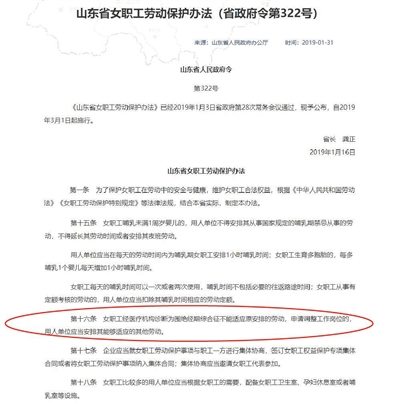 昨天,新京報(bào)記者從相關(guān)部門獲得的一份發(fā)布會文字資料顯示,為保護(hù)女職工在勞動中的安全與健康,維護(hù)女職工合法權(quán)益,制定了《辦法》《辦法》共26條,經(jīng)山東省政府第28次常務(wù)會議通過,2019年1月16日簽發(fā)公布,自2019年3月1日起施行。