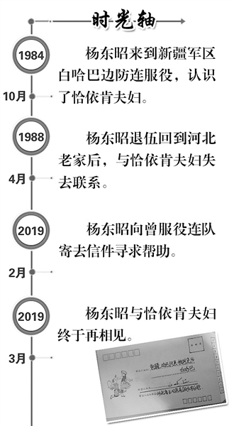 隨著時間的推移,楊東昭這個當年20歲的小伙子如今已年過半百,雖然日子過得越來越紅火,但內(nèi)心對兩位哈薩克族老人的思念越發(fā)強烈。在千家萬戶團聚歡樂的鞭炮聲中,他提筆寫了一封信寄到曾經(jīng)服役的連隊尋求幫助。