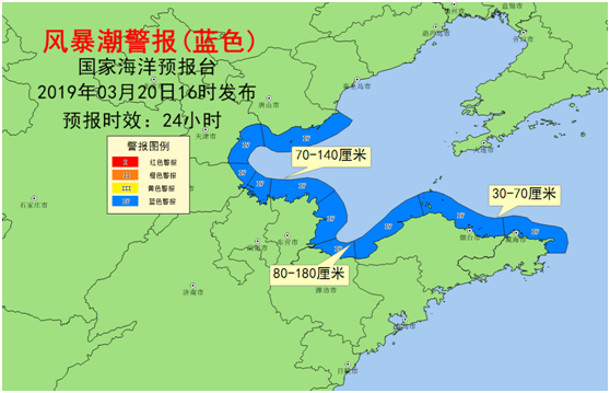 受冷空氣和出海氣旋的共同影響,預(yù)計(jì):3月20日傍晚到21日中午,渤海灣將出現(xiàn)70到140厘米的風(fēng)暴增水,萊州灣將出現(xiàn)80到180厘米的風(fēng)暴增水,山東半島北部沿海將出現(xiàn)30到70厘米的風(fēng)暴增水。上述岸段內(nèi)的天津塘沽、河北曹妃甸、黃驊和山東濱州港潮位站將于21日凌晨出現(xiàn)達(dá)到當(dāng)?shù)厮{(lán)色警戒潮位的高潮位。天津市、河北省唐山市、滄州市和山東省濱州市的風(fēng)暴潮預(yù)警級(jí)別為藍(lán)色。