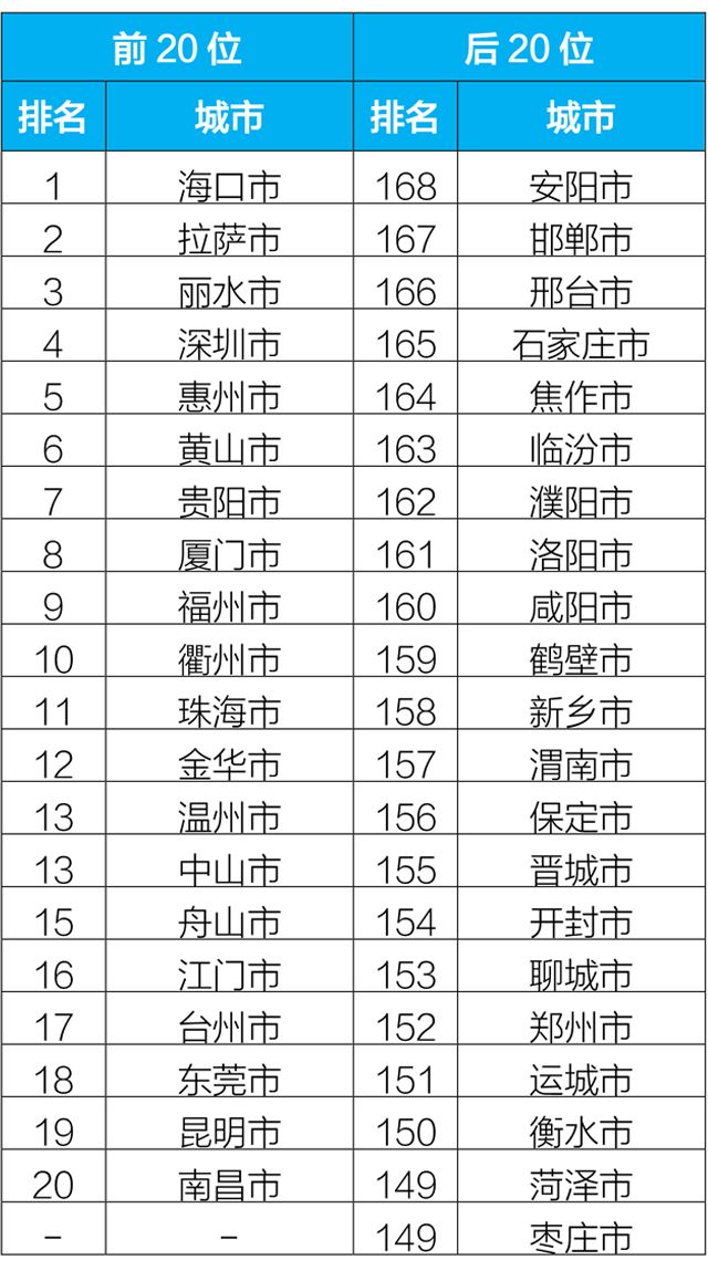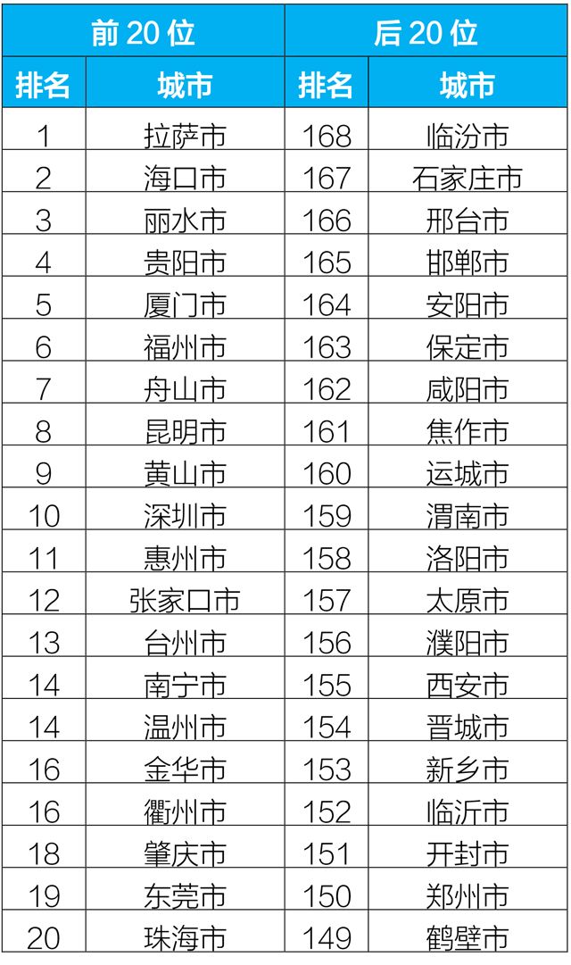 2019年1-2月,168個重點城市中臨汾、石家莊、邢臺市等20個城市空氣質量相對較差(從第168名到第149名);拉薩、??凇Ⅺ愃械?0個城市空氣質量相對較好。?