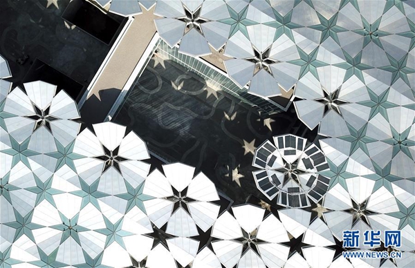 3月26日無人機(jī)拍攝的北京世園會園區(qū)“小行星”效果圖,位于畫面中心的建筑是中國館(電腦合成)。新華社記者 王建華 攝