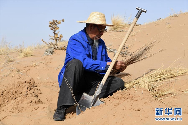 在甘肅省古浪縣境內(nèi)的黑崗沙風沙口,八步沙第二代治沙人用稻草壓沙(3月26日攝)。新華社記者 范培珅 攝