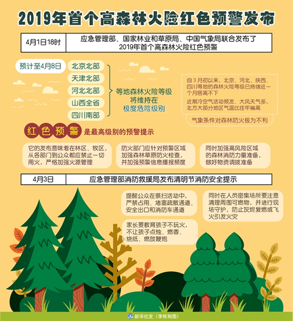 “此次紅色預(yù)警是三部門綜合考慮氣象條件、林區(qū)物候及衛(wèi)星林火監(jiān)測、清明節(jié)期間祭掃影響等情況,經(jīng)過會商研判共同發(fā)布的。”中國氣象局公共氣象服務(wù)中心副首席楊曉丹說,自3月初以來,北京、河北、陜西、四川等地的森林火險等級一直居高不下,已持續(xù)近一個月;近期冷空氣活動頻發(fā)、大風(fēng)天氣多,北方大部分地區(qū)氣溫比往年偏高,氣象條件對森林防火極為不利。