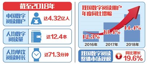 4月12日至14日,第五屆中國數(shù)字閱讀大會在杭州召開。會上發(fā)布的《2018年度中國數(shù)字閱讀白皮書》顯示,截至2018年,中國數(shù)字閱讀用戶總量達(dá)到4.32億,人均數(shù)字閱讀量達(dá)到12.4本,人均單次閱讀時(shí)長達(dá)71.3分鐘。我國數(shù)字閱讀整體市場規(guī)模已達(dá)到254.5億元,同比增長19.6%,大眾閱讀市場規(guī)模占比逾九成,是產(chǎn)業(yè)發(fā)展主導(dǎo)力量。