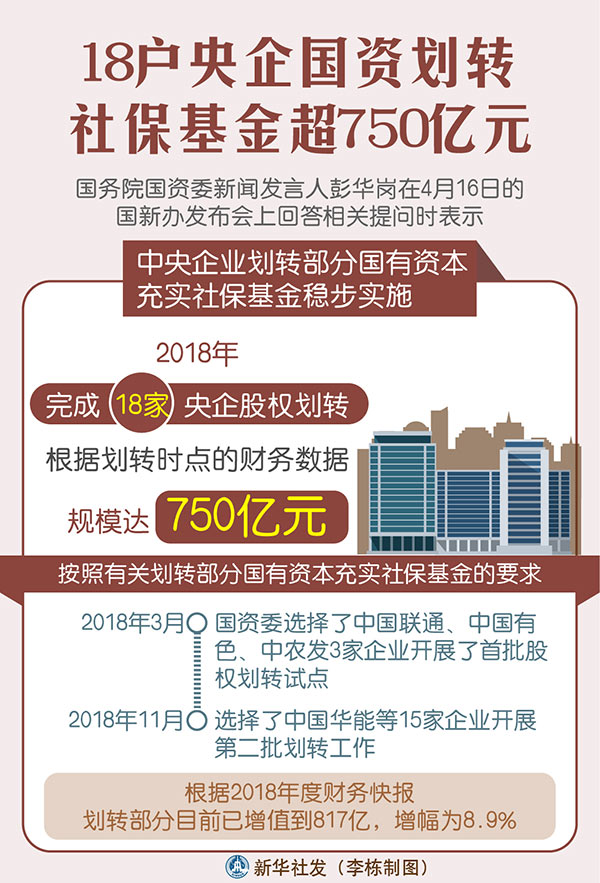 新華社北京4月16日電(記者王希)國務院國資委新聞發(fā)言人彭華崗16日說,中央企業(yè)劃轉(zhuǎn)部分國有資本充實社保基金穩(wěn)步實施,2018年完成18家央企股權(quán)劃轉(zhuǎn),根據(jù)劃轉(zhuǎn)時點的財務數(shù)據(jù),規(guī)模達750億元。