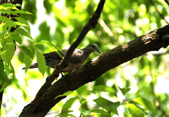 記者居住的小區(qū)里鳥也很多,陽臺下面一棵廣玉蘭樹上,一對珠頸斑鳩已經(jīng)安家了很多年。經(jīng)??匆姴弊由虾孟翊髦蝗φ渲轫楁湹闹轭i斑鳩,結(jié)伴到小區(qū)草地上覓食,熟悉得好像小區(qū)里的老鄰居。