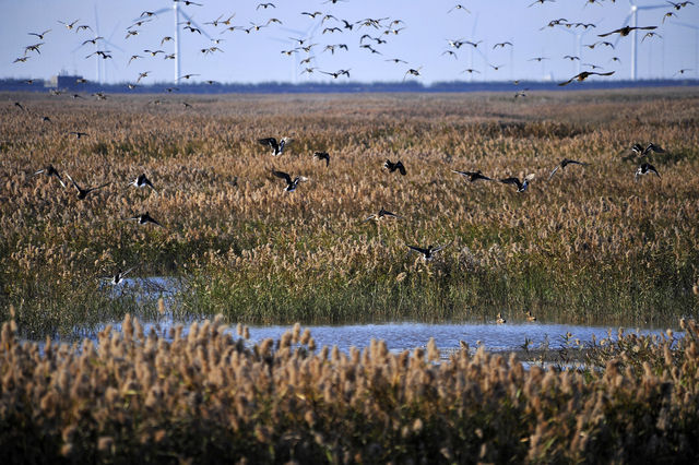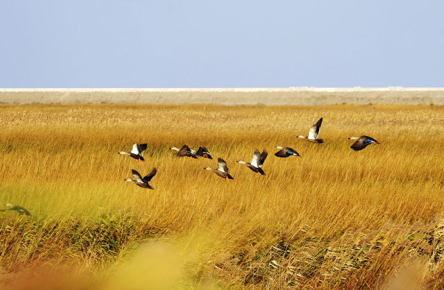 這組照片拍攝于上海著名的崇明東灘濕地,當時正值初冬時節(jié)。曲水彎環(huán)的蘆葦叢中,成群結(jié)隊的越冬候鳥時而悠閑覓食,時而群鳥歡飛,譜寫了一曲美妙的自然樂章。