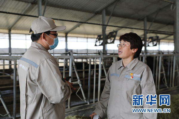 圖為叢慧敏在檢查奶牛吃的飼料。新華網(wǎng)汪亞/攝