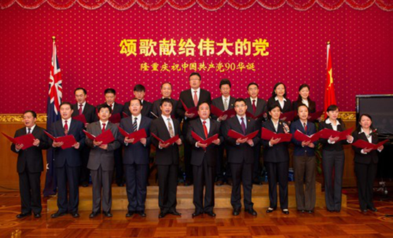 2011年7月1日,在澳大利亞首都堪培拉,中國駐澳大利亞大使陳育明(前中)與館員們合唱歌曲《我和我的祖國》。當(dāng)日,中國駐澳大利亞大使館舉辦“頌歌獻(xiàn)給偉大的黨”活動,慶祝中國共產(chǎn)黨建黨90周年。 新華社發(fā)(白雪攝)