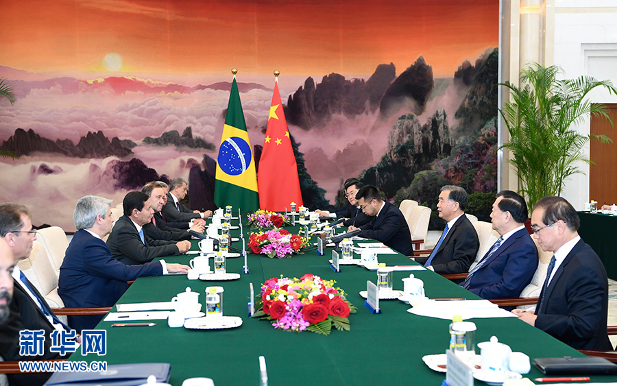 5月24日,全國政協(xié)主席汪洋在北京人民大會堂會見巴西副總統(tǒng)莫朗。新華社記者 張領(lǐng) 攝