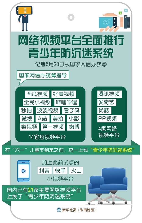 新華社北京5月28日電(記者余俊杰)記者28日從國家網(wǎng)信辦獲悉,國家網(wǎng)信辦統(tǒng)籌指導(dǎo)西瓜視頻、好看視頻、全民小視頻、嗶哩嗶哩、秒拍、波波視頻、看了嗎、微視、A站、美拍、小影、梨視頻、第一視頻、微博等14家短視頻平臺(tái),以及騰訊視頻、愛奇藝、優(yōu)酷、PP視頻等4家網(wǎng)絡(luò)視頻平臺(tái),在“六一”兒童節(jié)到來之前,統(tǒng)一上線“青少年防沉迷系統(tǒng)”。
