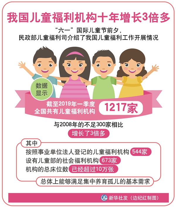 新華社北京5月31日電(記者羅爭(zhēng)光)“六一”國(guó)際兒童節(jié)前夕,民政部?jī)和@窘榻B了我國(guó)兒童福利工作開展情況。數(shù)據(jù)顯示,截至今年一季度,全國(guó)共有兒童福利機(jī)構(gòu)1217家,與2008年的不足300家相比,增長(zhǎng)了3倍多。