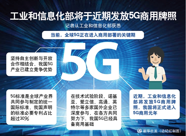 新華社北京6月3日電(記者張辛欣)記者從工業(yè)和信息化部獲悉,當(dāng)前,全球5G正在進(jìn)入商用部署的關(guān)鍵期。堅(jiān)持自主創(chuàng)新與開放合作相結(jié)合,我國5G產(chǎn)業(yè)已建立競爭優(yōu)勢。5G標(biāo)準(zhǔn)是全球產(chǎn)業(yè)界共同參與制定的統(tǒng)一國際標(biāo)準(zhǔn),我國聲明的標(biāo)準(zhǔn)必要專利占比超過30%。在技術(shù)試驗(yàn)階段,諾基亞、愛立信、高通、英特爾等多家國外企業(yè)已深度參與,在各方共同努力下,我國5G已經(jīng)具備商用基礎(chǔ)。近期,工業(yè)和信息化部將發(fā)放5G商用牌照,我國將正式進(jìn)入5G商用元年。我們一如既往地歡迎國內(nèi)外企業(yè)積極參與我國5G網(wǎng)絡(luò)建設(shè)和應(yīng)用推廣,共同分享我國5G發(fā)展成果。